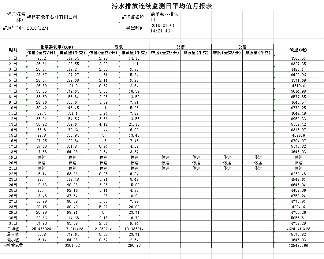 污水排放連續監測日平均值月報表12月