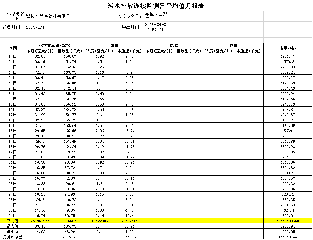 2019年3月污水排放連續監測日平均值月報表