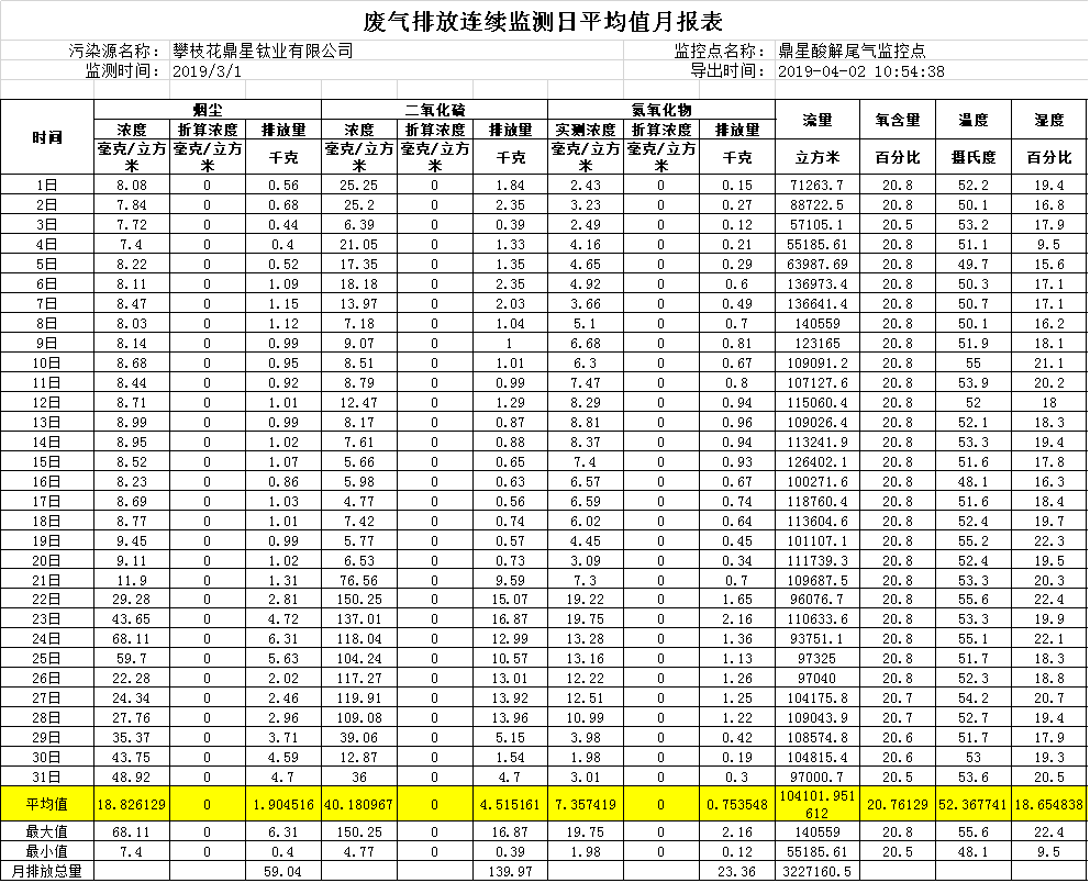 2019年3月酸解尾氣排放連續監測日平均值月報表