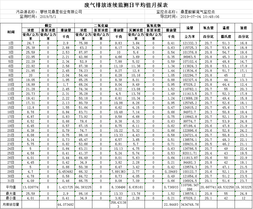 2019年5月酸解尾氣排放連續監測日平均值月報表