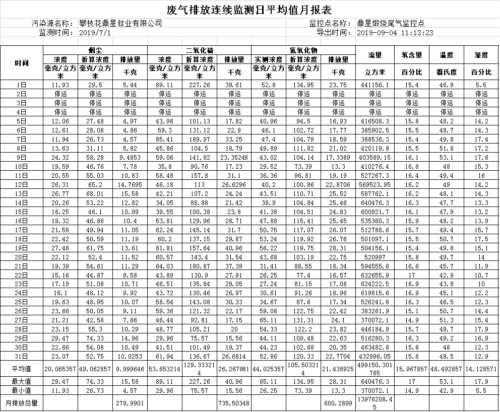 2019年7月煅燒尾氣排放連續監測日平均值月報表