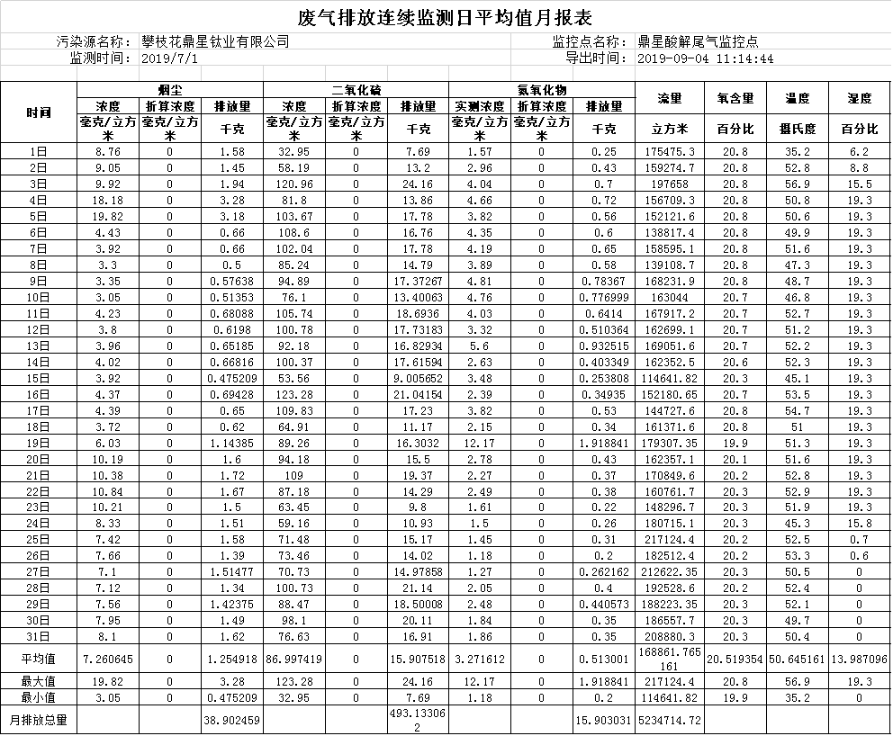 2019年7月酸解尾氣排放連續監測日平均值月報表