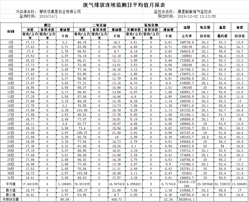 2019年10月酸解尾氣排放連續監測日平均值月報表