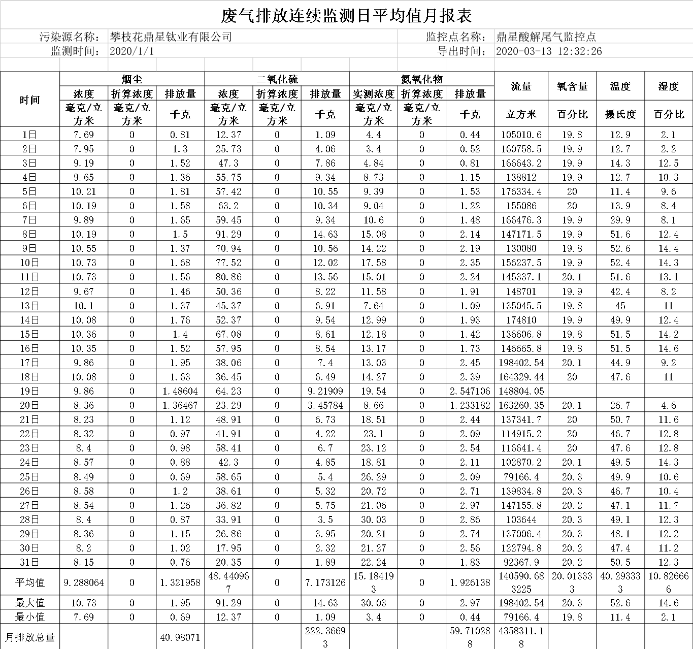 2020年01月酸解尾氣排放連續監測日平均值月報表