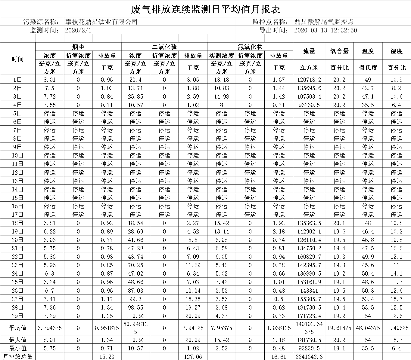2020年02月酸解尾氣排放連續監測日平均值月報表