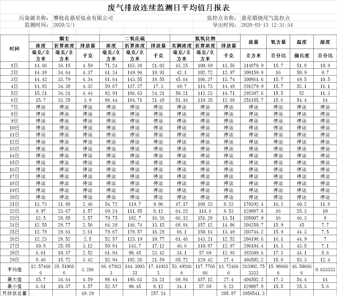2020年02月煅燒尾氣排放連續監測日平均值月報表