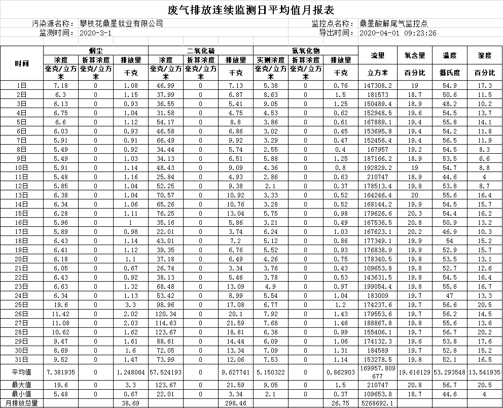 2020年03月酸解尾氣排放連續監測日平均值月報表
