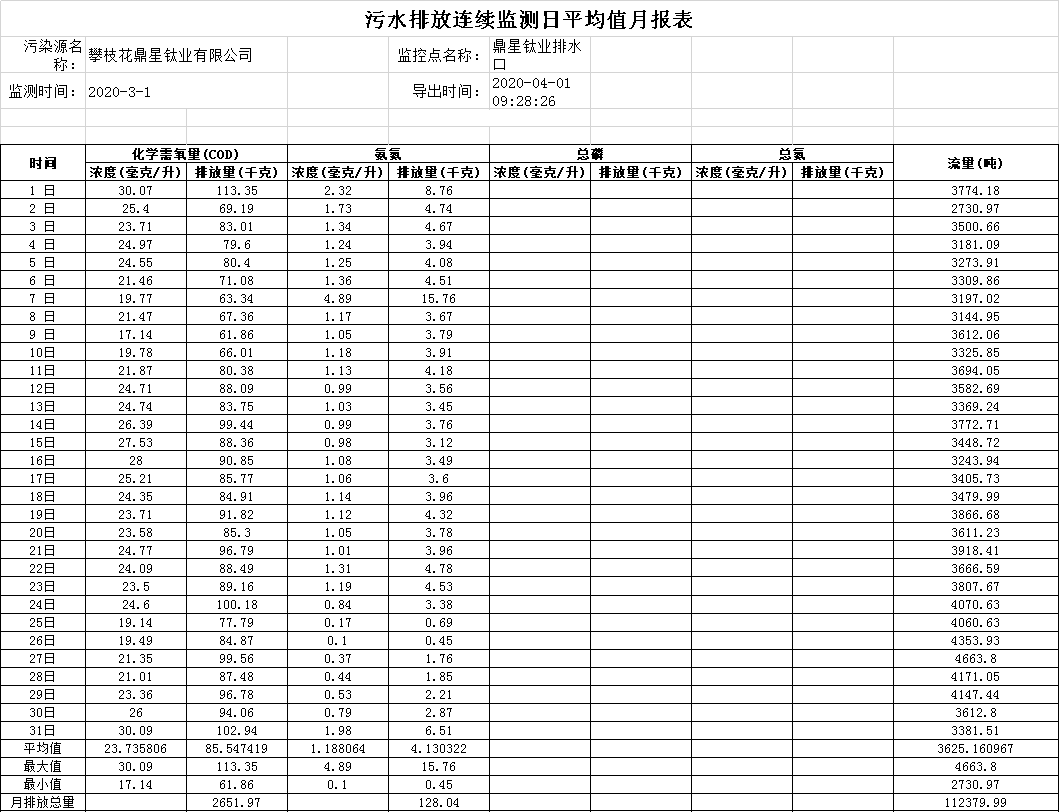2020年03月污水排放連續監測日平均值月報表