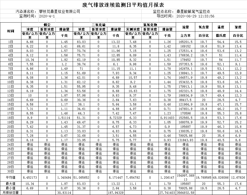 2020年04月酸解尾氣排放連續監測日平均值月報表