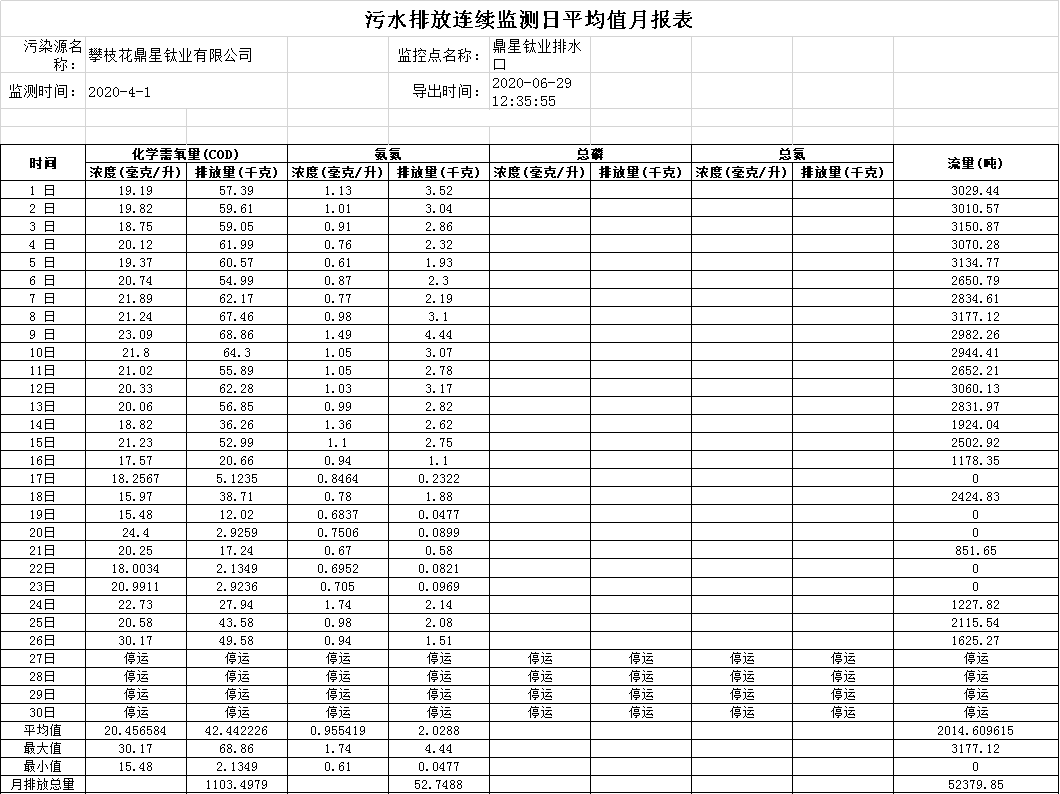 2020年04月污水排放連續監測日平均值月報表