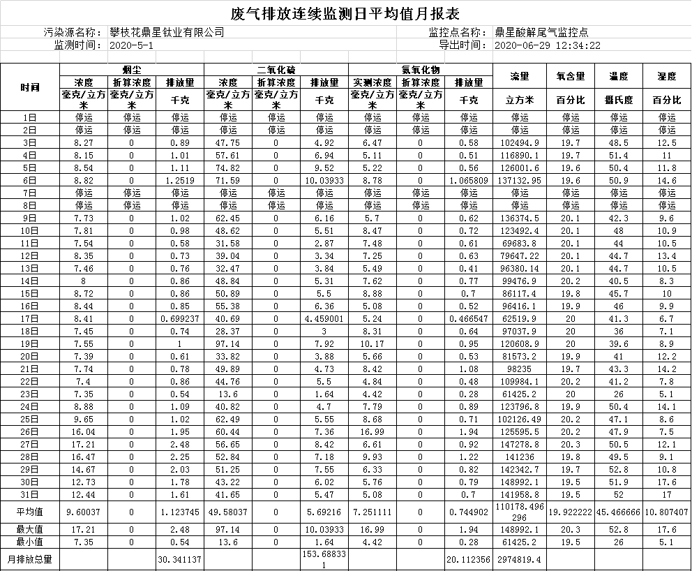 2020年05月酸解尾氣排放連續監測日平均值月報表