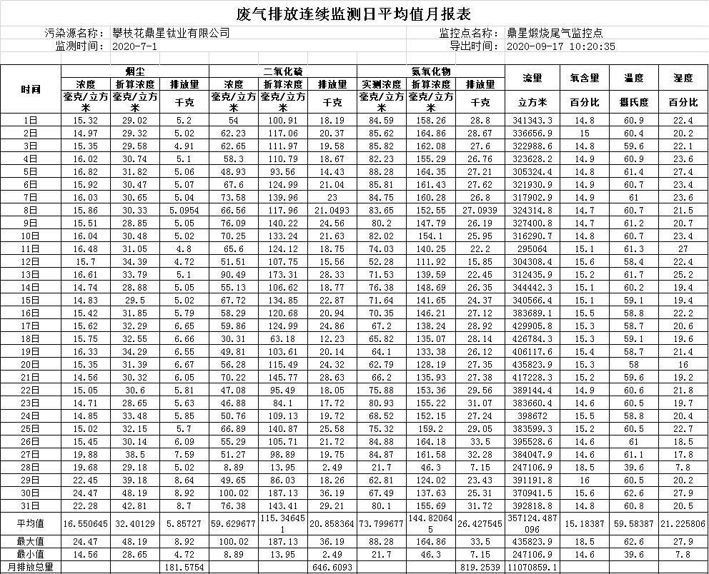 2020年07月煅燒尾氣排放連續監測日平均值月報表