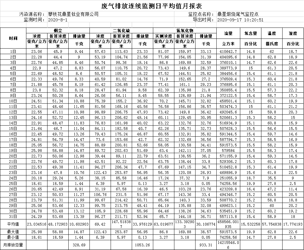2020年08月煅燒尾氣排放連續監測日平均值月報表