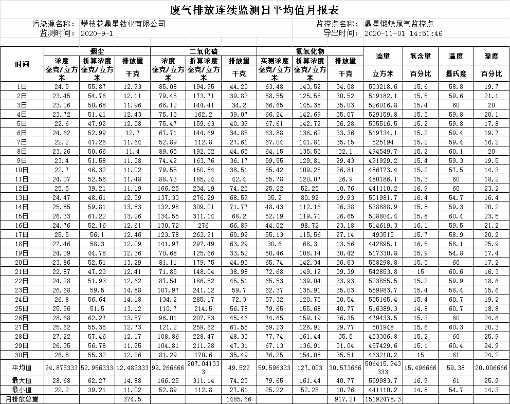 2020年09月煅燒尾氣排放連續監測日平均值月報表