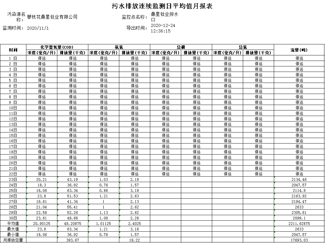 2020年環保外排水11月在線數據