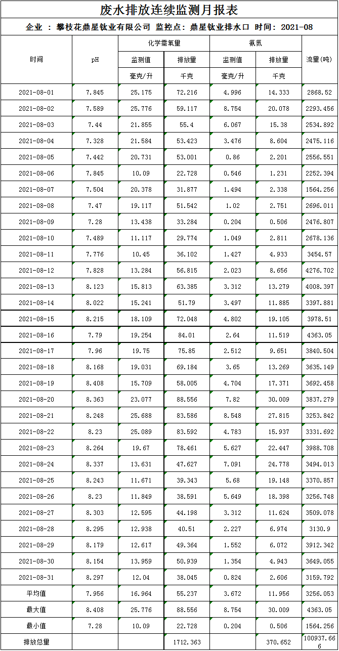 2021年8月廢水排放連續監測月報表