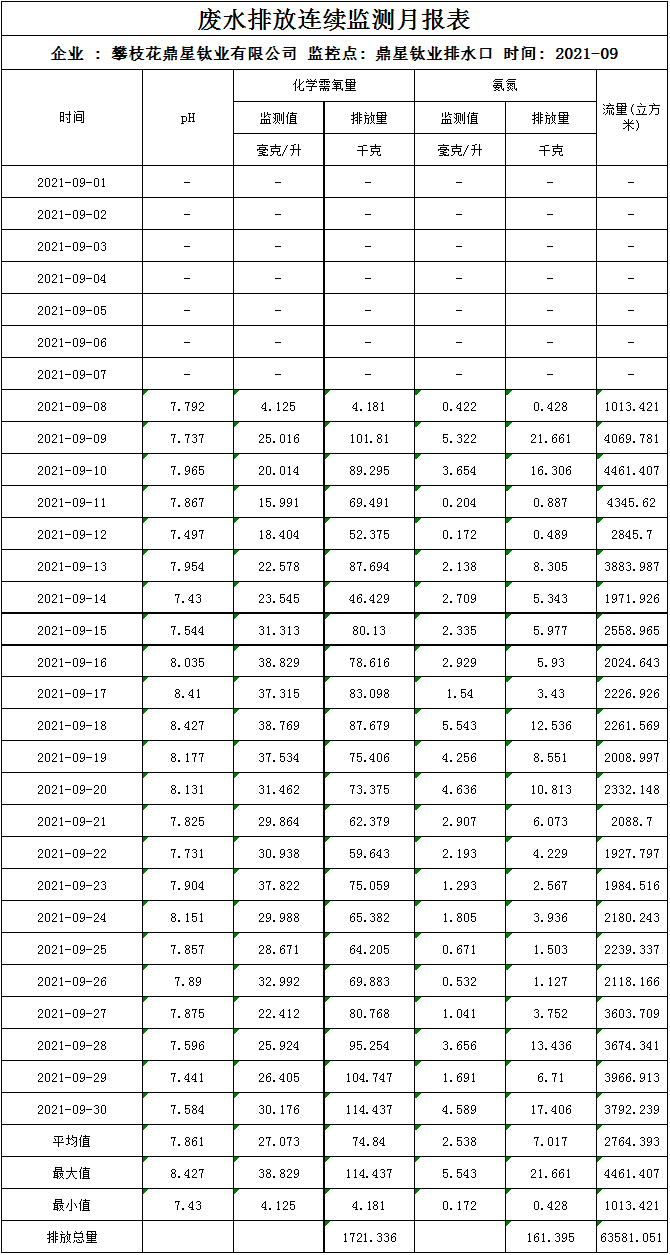 2021年9月廢水廢水排放連續監測月報表