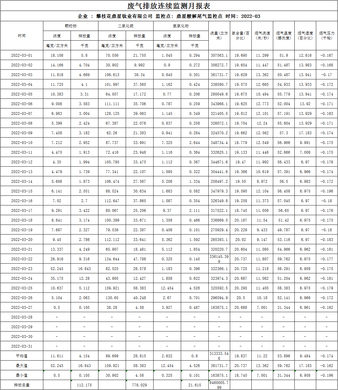 2022年3月酸解廢氣排放連續監測月報表