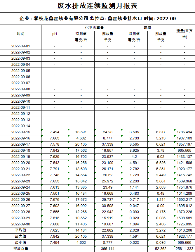 2022年9月廢水排放連續監測月報表