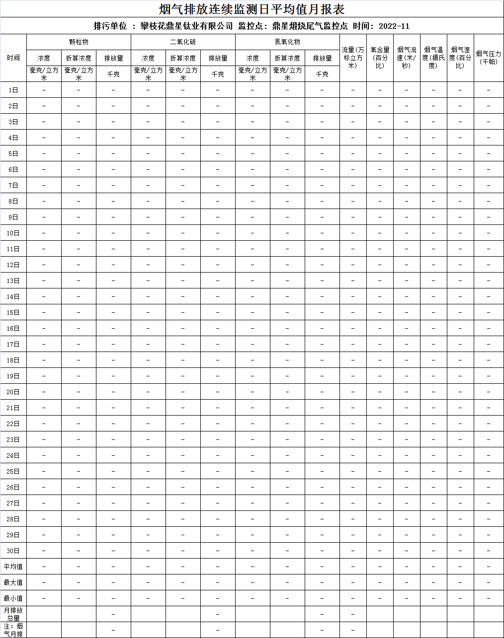 2022年11月煅燒煙氣排放連續監測日平均值月報表