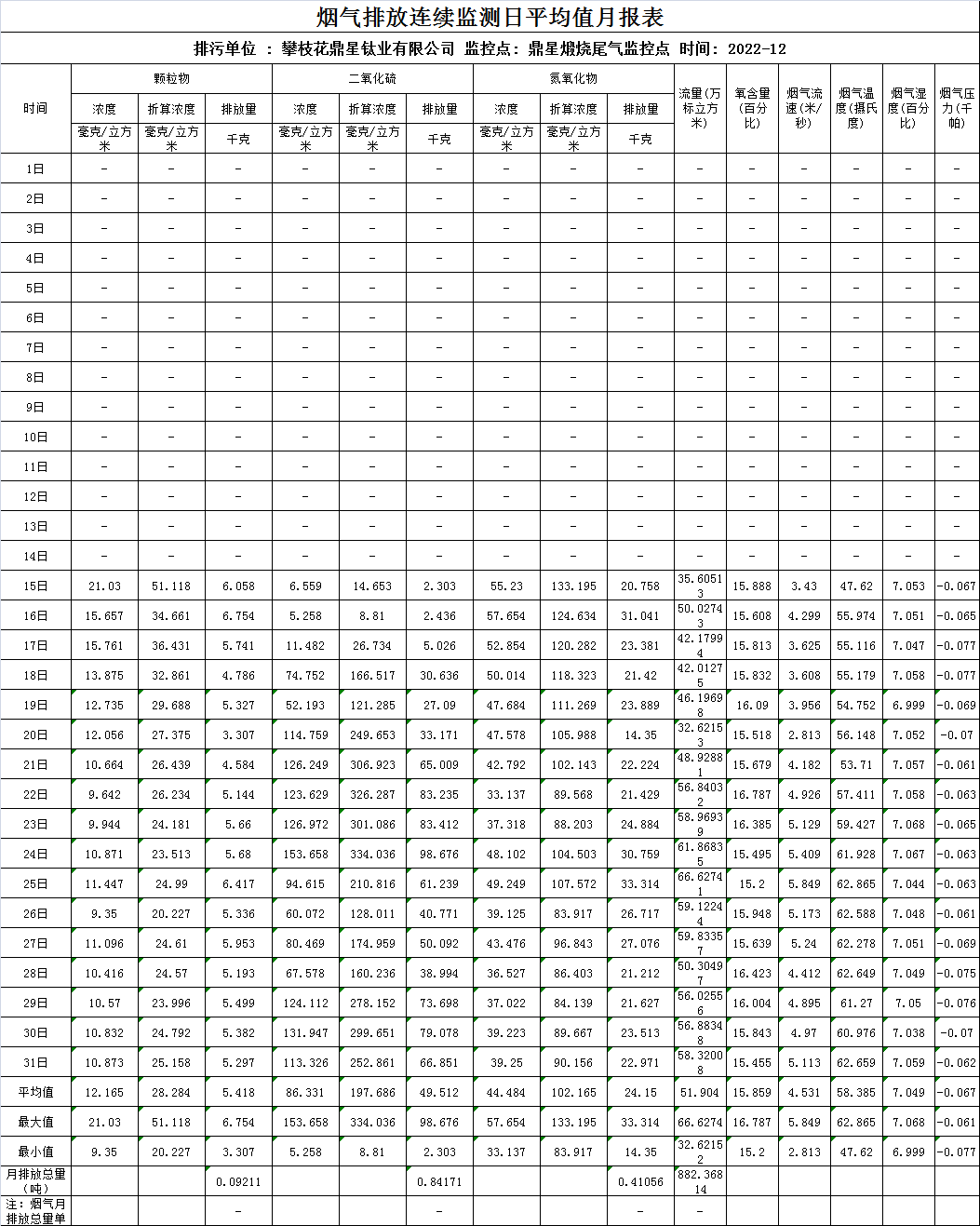 2022年12月煅燒煙氣排放連續監測日平均值月報表