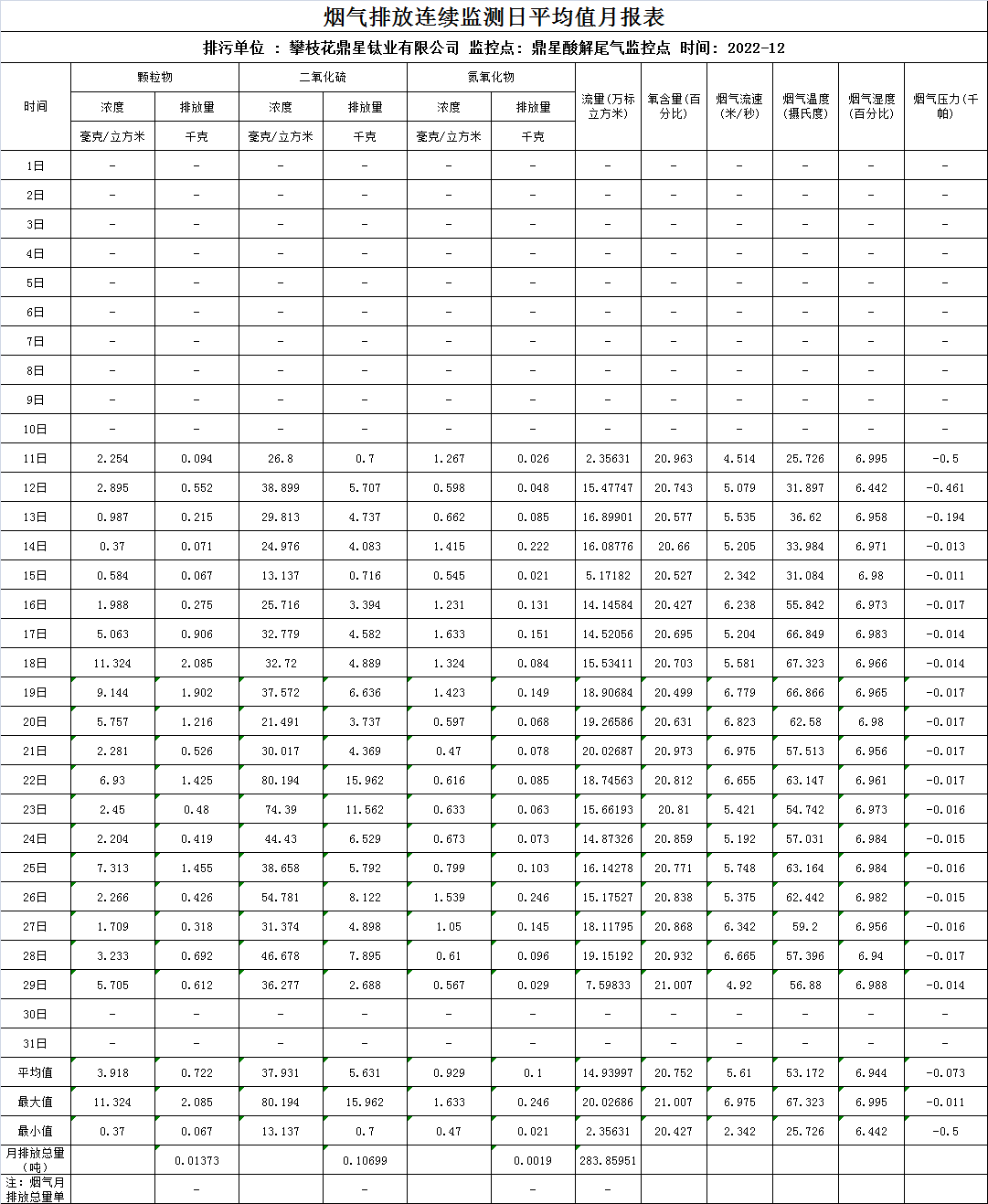 2022年12月酸解煙氣排放連續監測日平均值月報表.