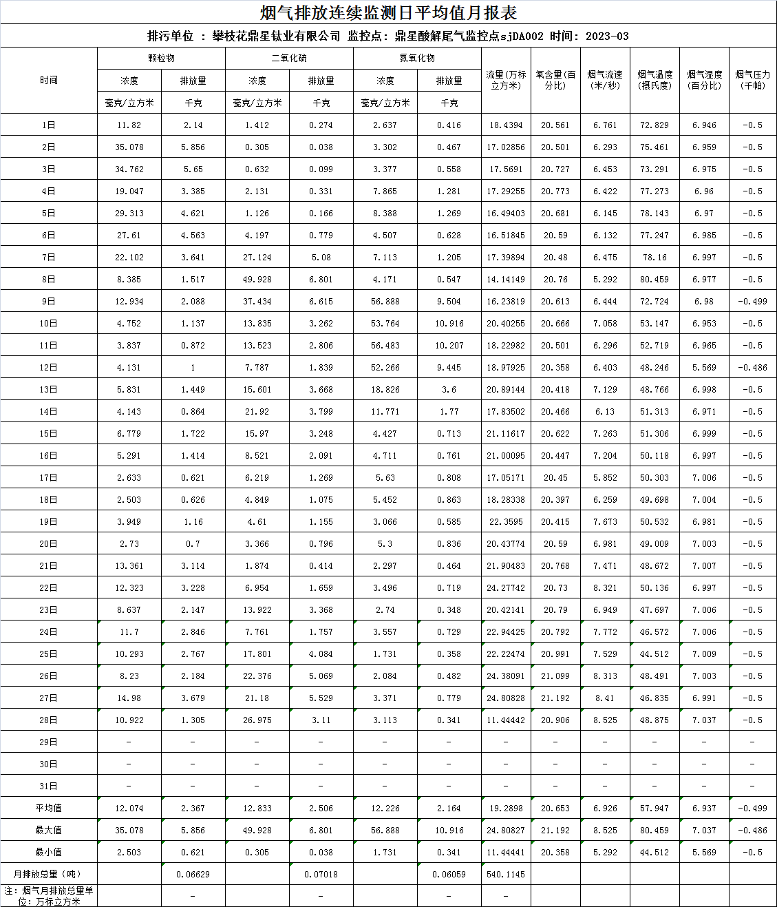 2023年3月酸解煙氣排放連續監測日平均值月報表