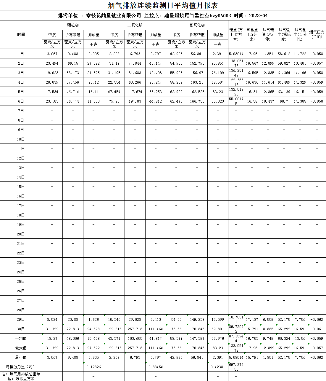 2023年4月煙氣排放連續監測日平均值月報表