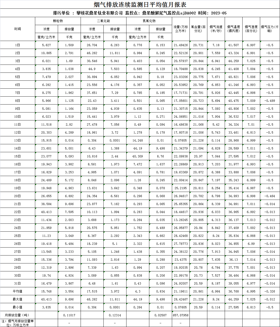 2023年5月酸解煙氣排放連續監測日平均值月報表