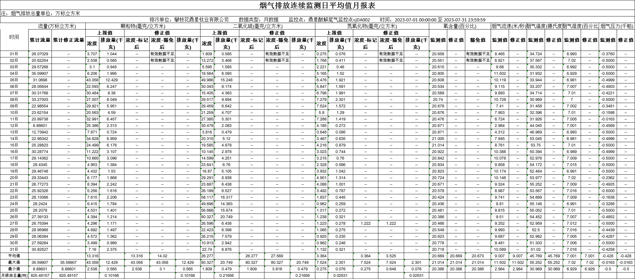 2023年7月酸解煙氣排放連續監測日平均值月報表