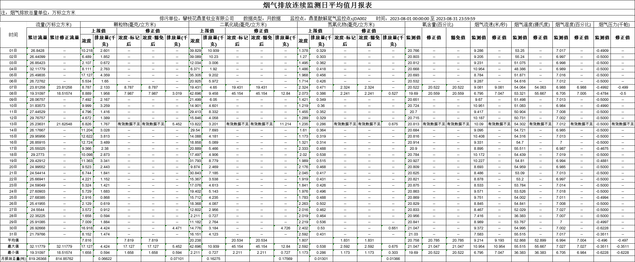 2023年8月酸解煙氣排放連續監測日平均值月報表