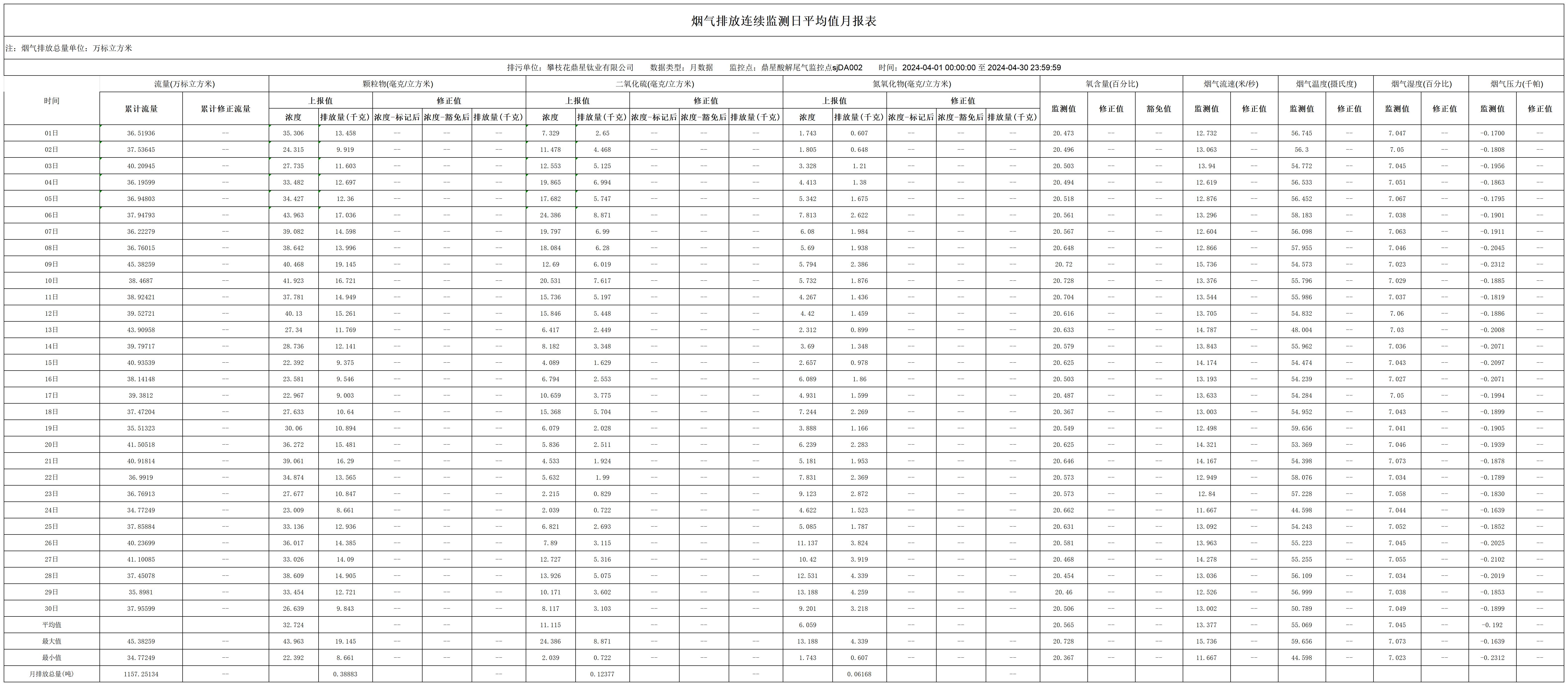 2024年4月酸解煙氣排放連續監測日平均值月報表
