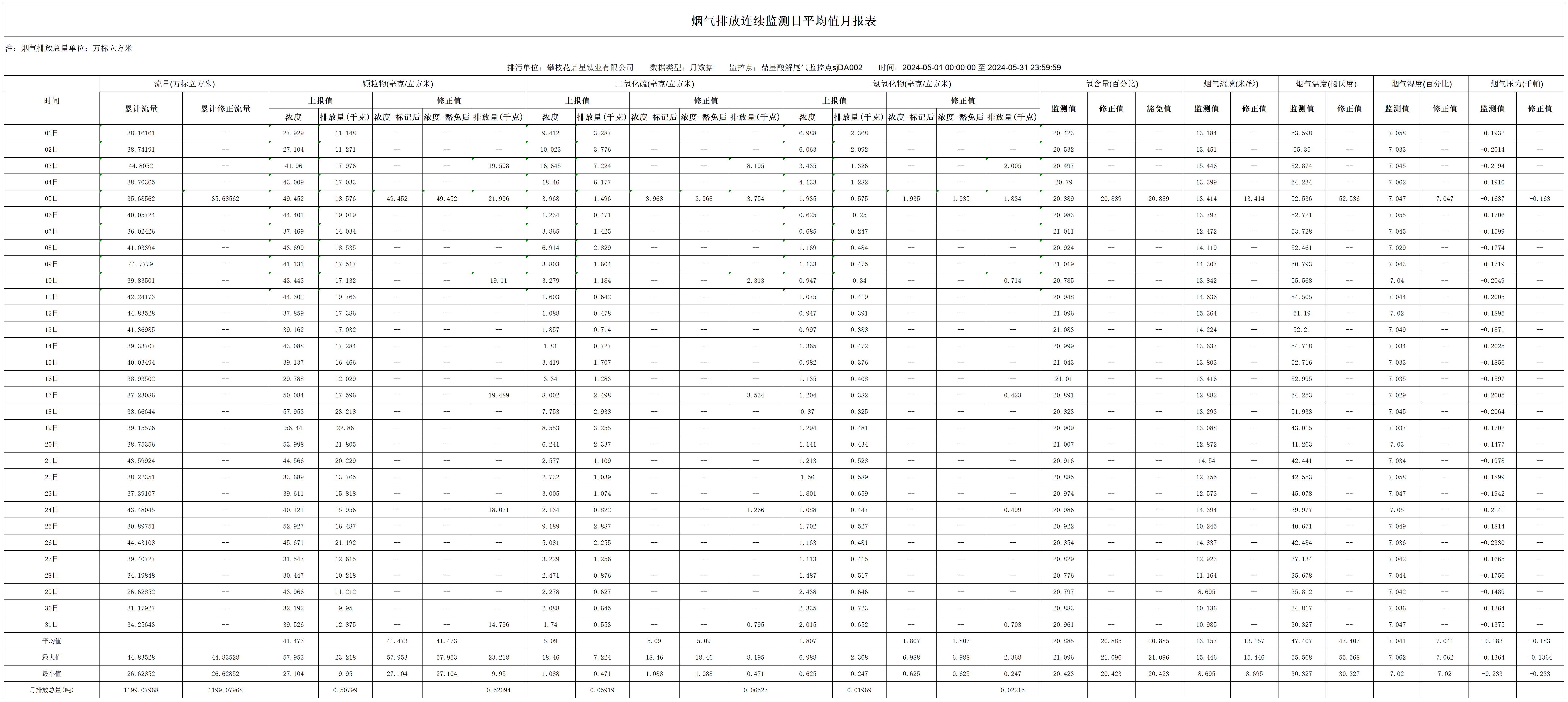 2024年5月酸解煙氣排放連續監測日平均值月報表