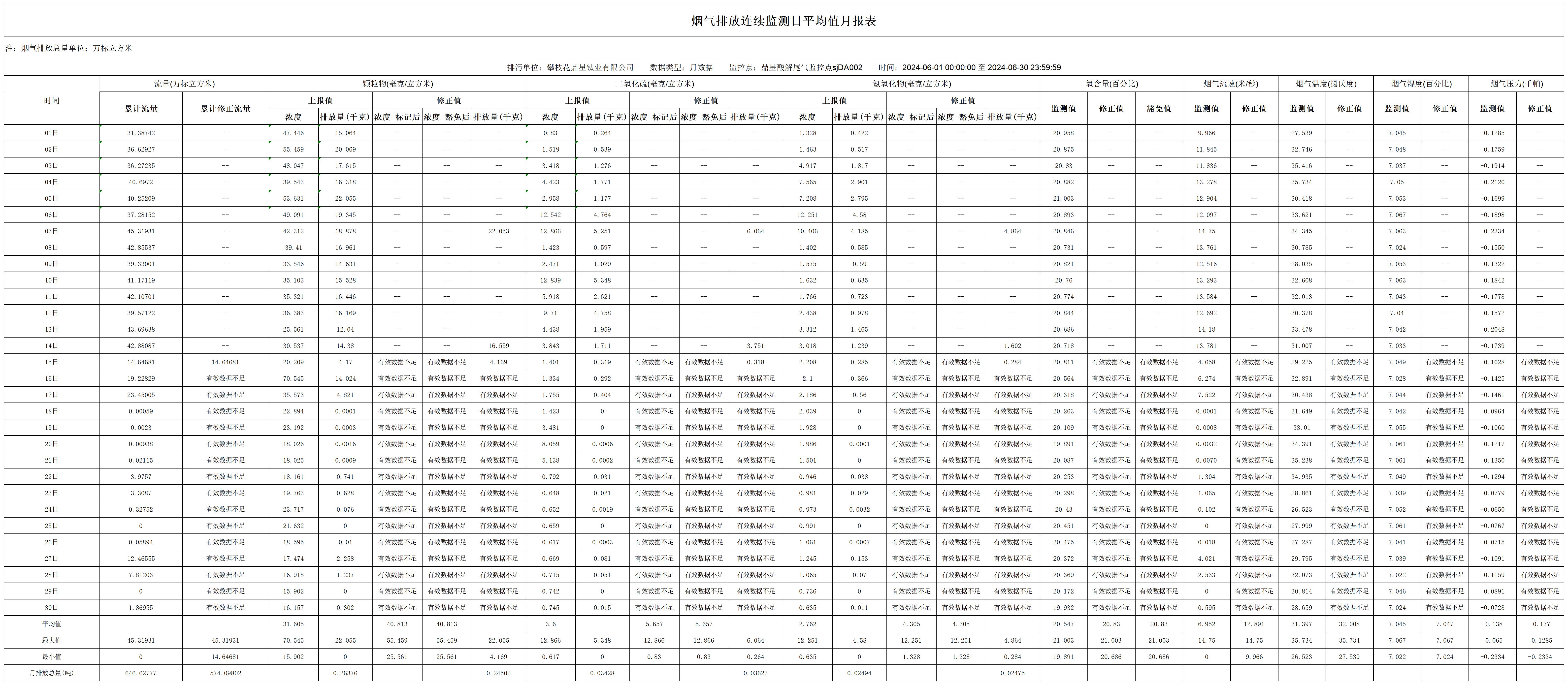 2024年6月酸解煙氣排放連續監測日平均值月報表