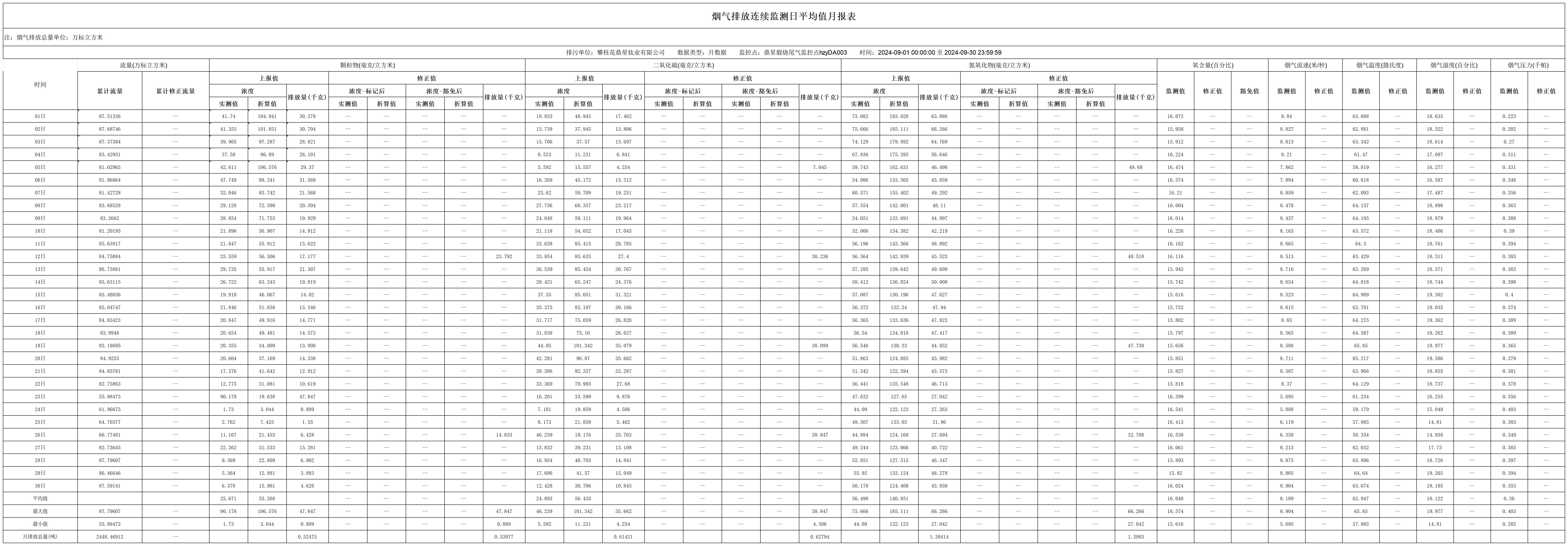 2024年9月煅燒煙氣排放連續監測日平均值月報表